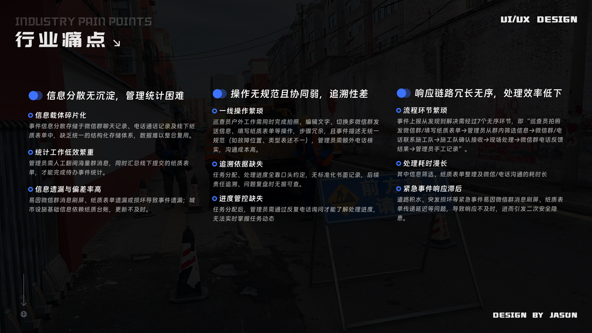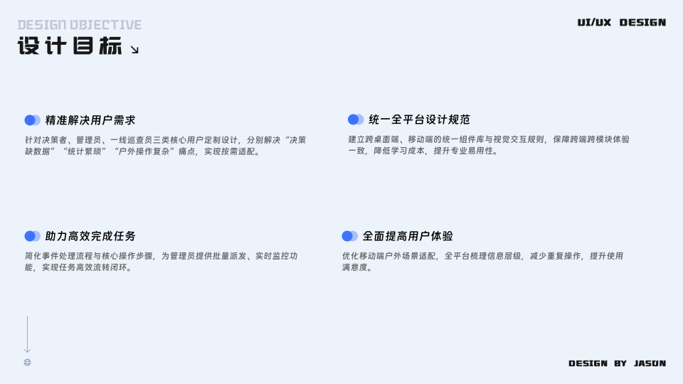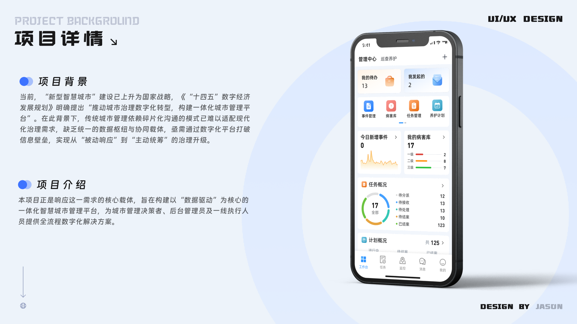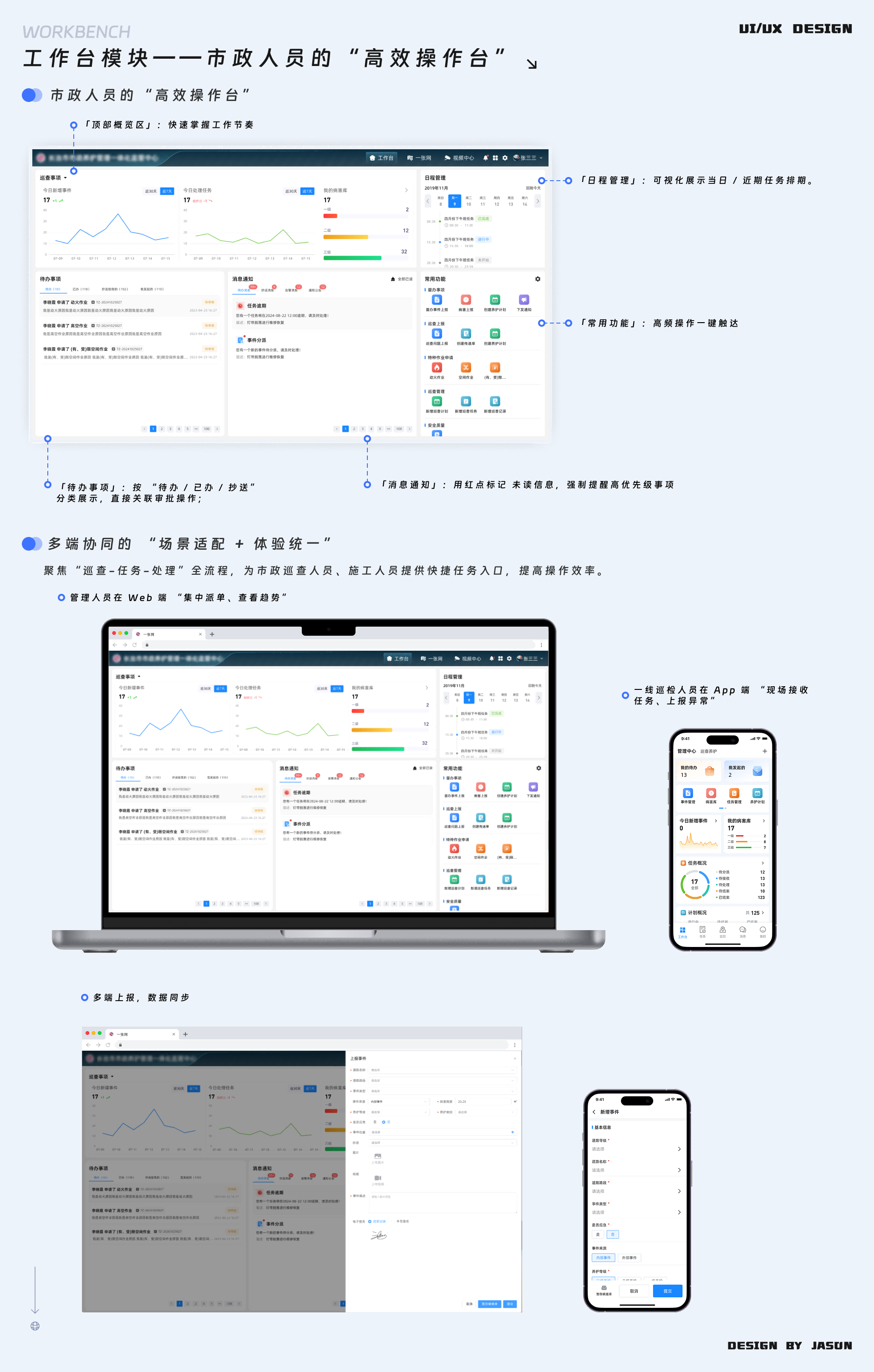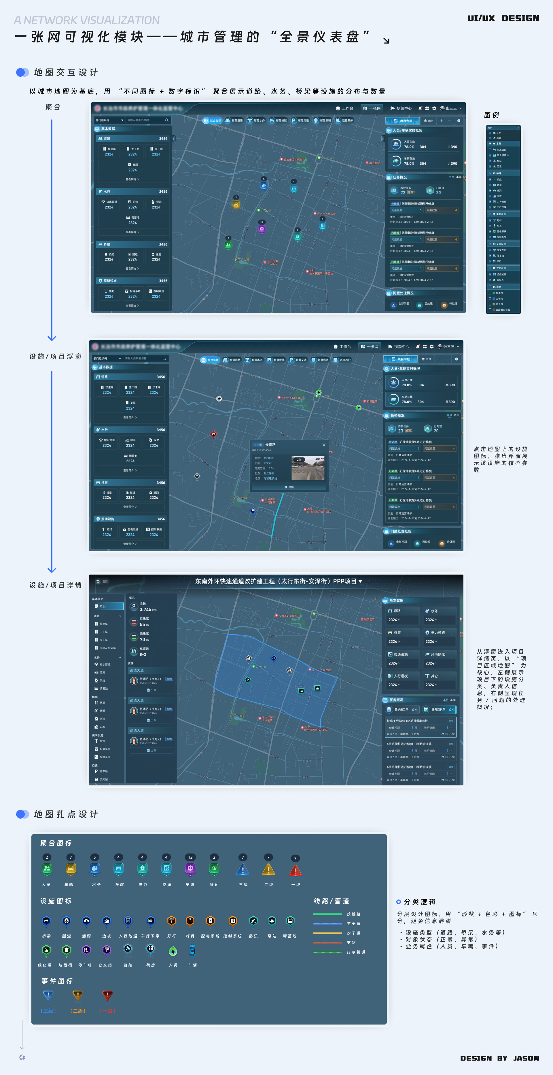 参与讨论 市政养护管理云平台 2025年12月27日 16:22 作品集 PCAPPB端 市政养护管理云平台是2025年上半年做的一个项目,其中一张图,系统设置部分功能是基于之前的设计进行了迭代,事件管理、安全质量管理模块是独立从了解需求,到原型绘制/确认,设计图绘制,编写需求文档,对接开发全流程独立完成的模块,也极大的提高了自身的需求理解能力。 参与讨论 (Participate in the discussion) 参与讨论